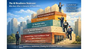 He scans the whiteboard. “AI Transformation Roadmap.” Boxes and arrows everywhere. “Phase 1: Automate customer onboarding. Phase 2: AI-assisted reporting. Phase 3: Intelligent document routing.”