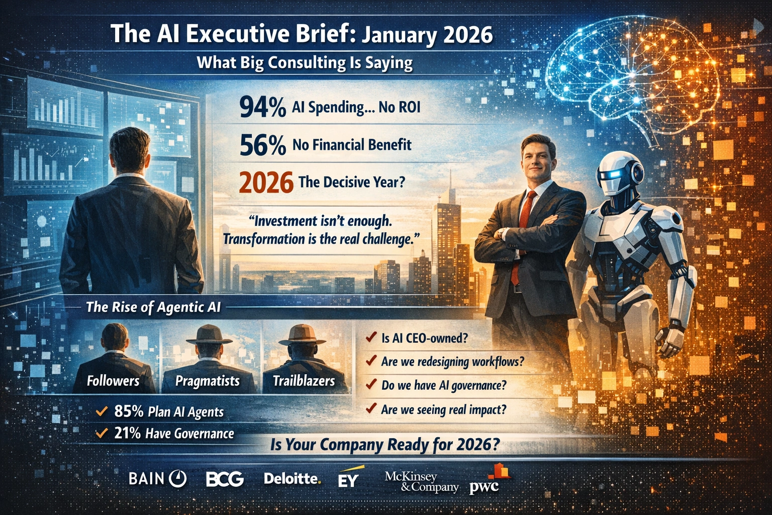 This brief synthesizes what Bain, BCG, Deloitte, EY, McKinsey, and PwC are telling their clients in January 2026. The message is remarkably consistent: the window between AI leaders and laggards is closing, and the differentiator isn’t spending — it’s organizational transformation.