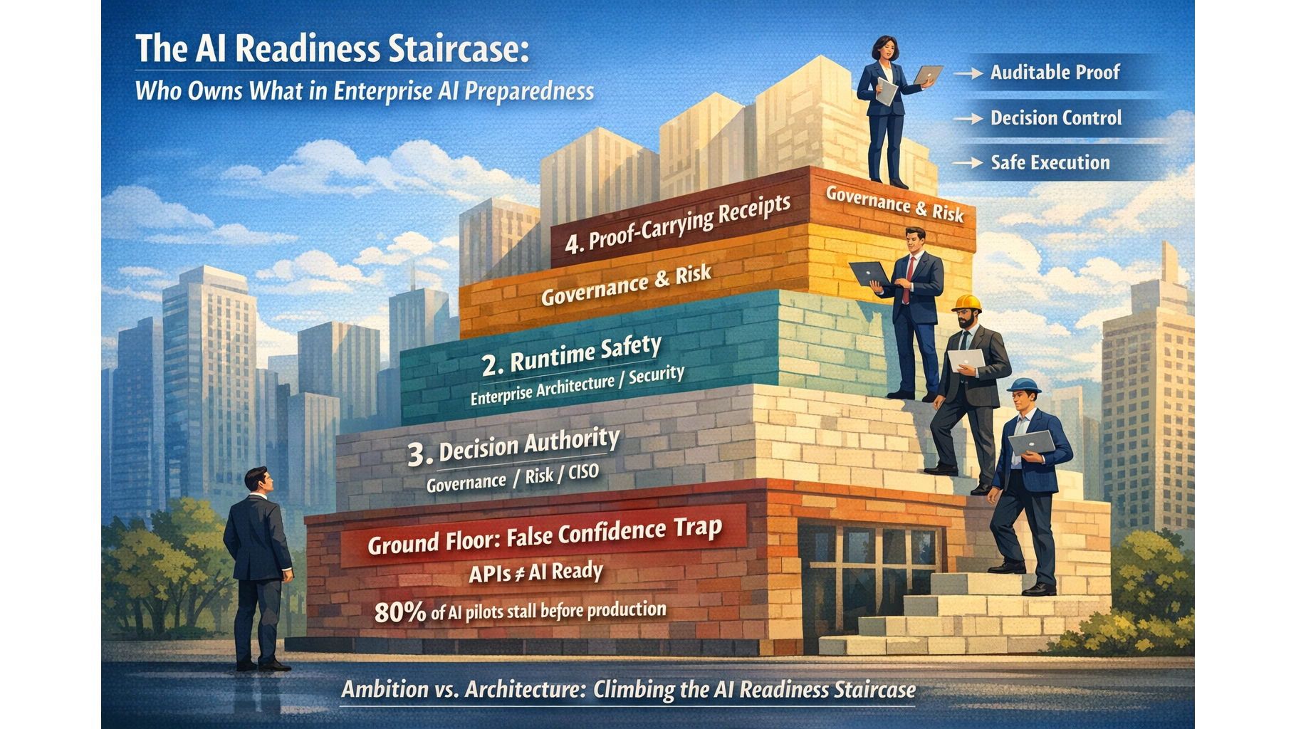 - Enterprise AI readiness has four stacked layers: application fitness, runtime safety, decision-time authority, and proof-carrying receipts. Most organisations complete one and declare victory.