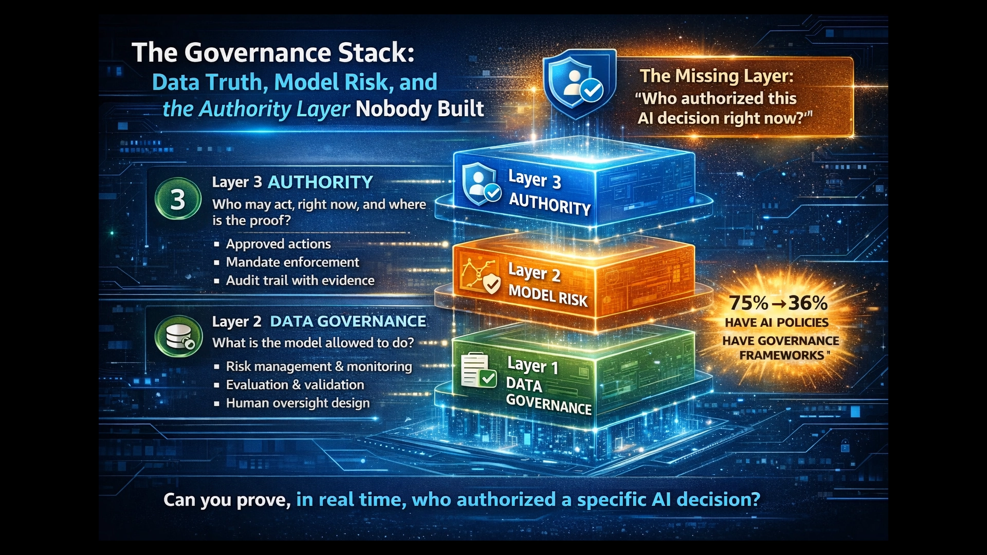 - Three layers required: Data governance (“what is true enough to use?”), AI governance (“what is the model allowed to do?”), and authority infrastructure (“who may act, right now, and where is the proof?”).