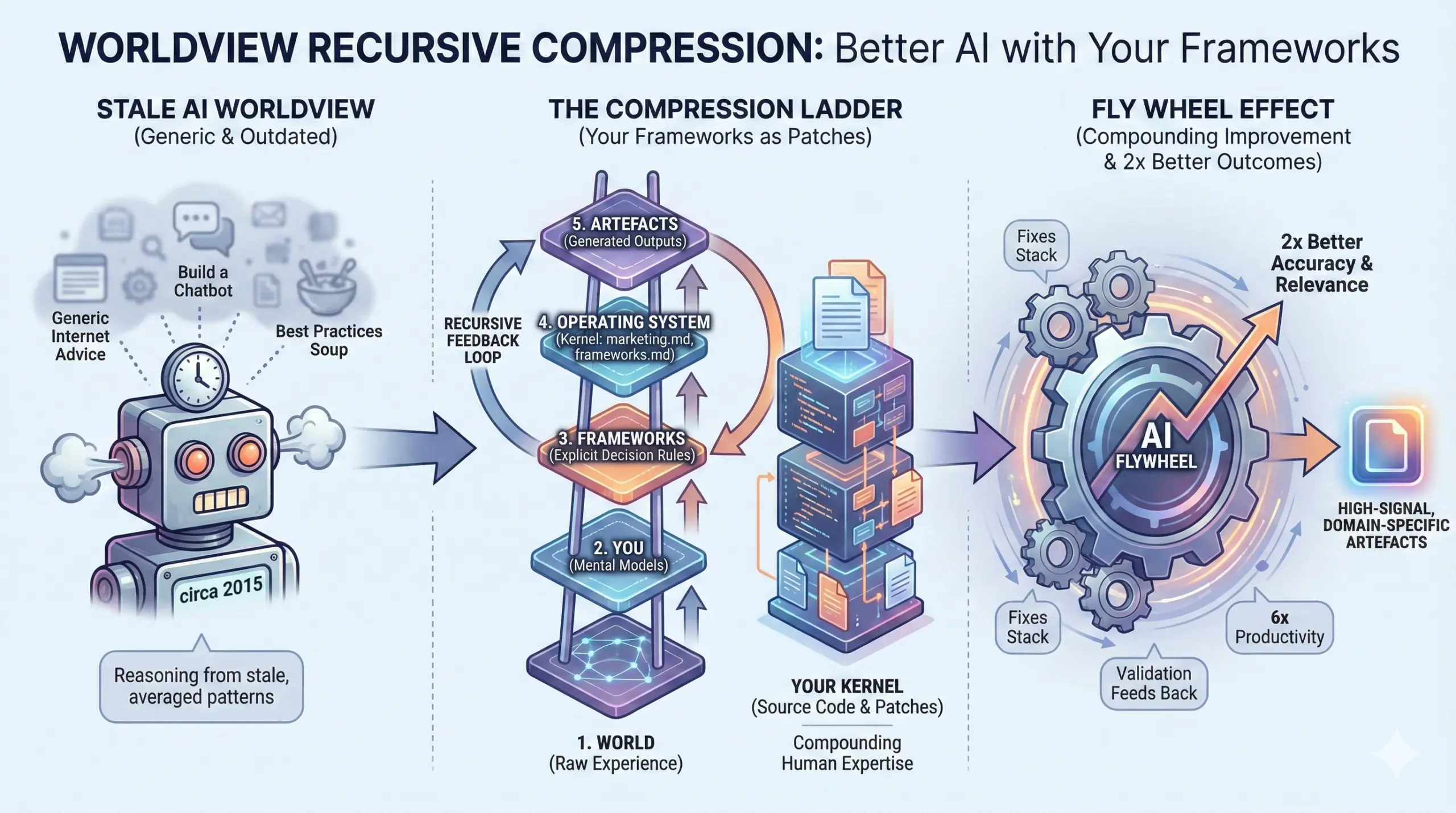 And the fix isn’t better prompting or waiting for the next model upgrade. It’s compiling your worldview into frameworks that patch the model’s stale, generic reasoning with your hard-won domain expertise.
